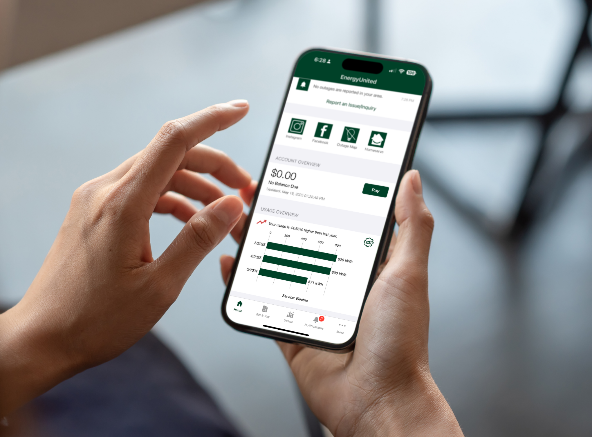 Meet the secure, convenient platform to pay your bill, monitor your energy spending and more. Available on our website or as a mobile app, My EnergyHub has multiple features that make managing your account as easy as possible. Plus, you can notify EnergyUnited of outages, get alerts, and have access to other great features, right on your smartphone or computer.
