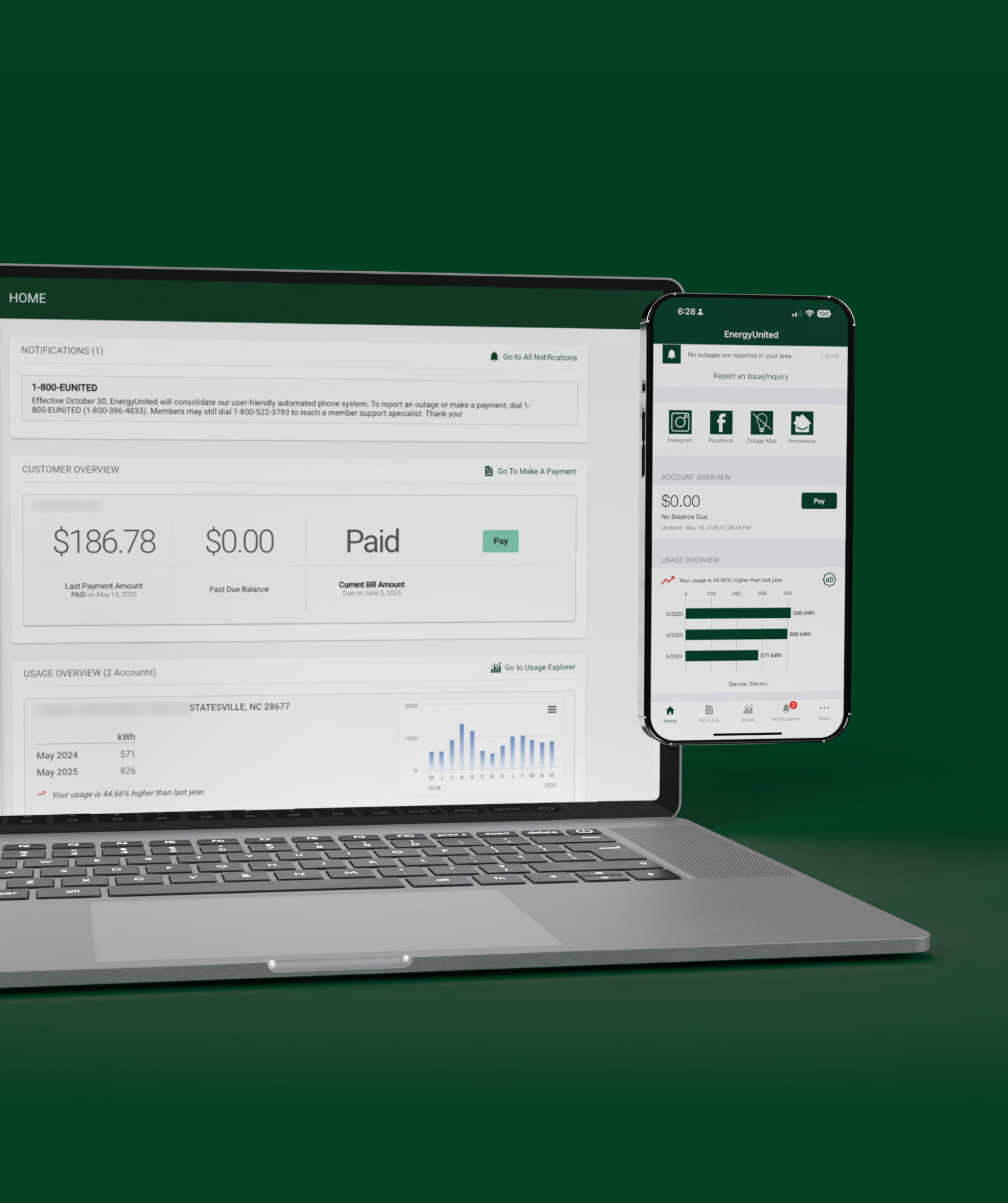My EnergyHub allows you to customize how EnergyUnited communicates with you, so you get the information you need, however you want it. Set outage alerts, subscribe to communications, or even go paperless—the choice is yours.