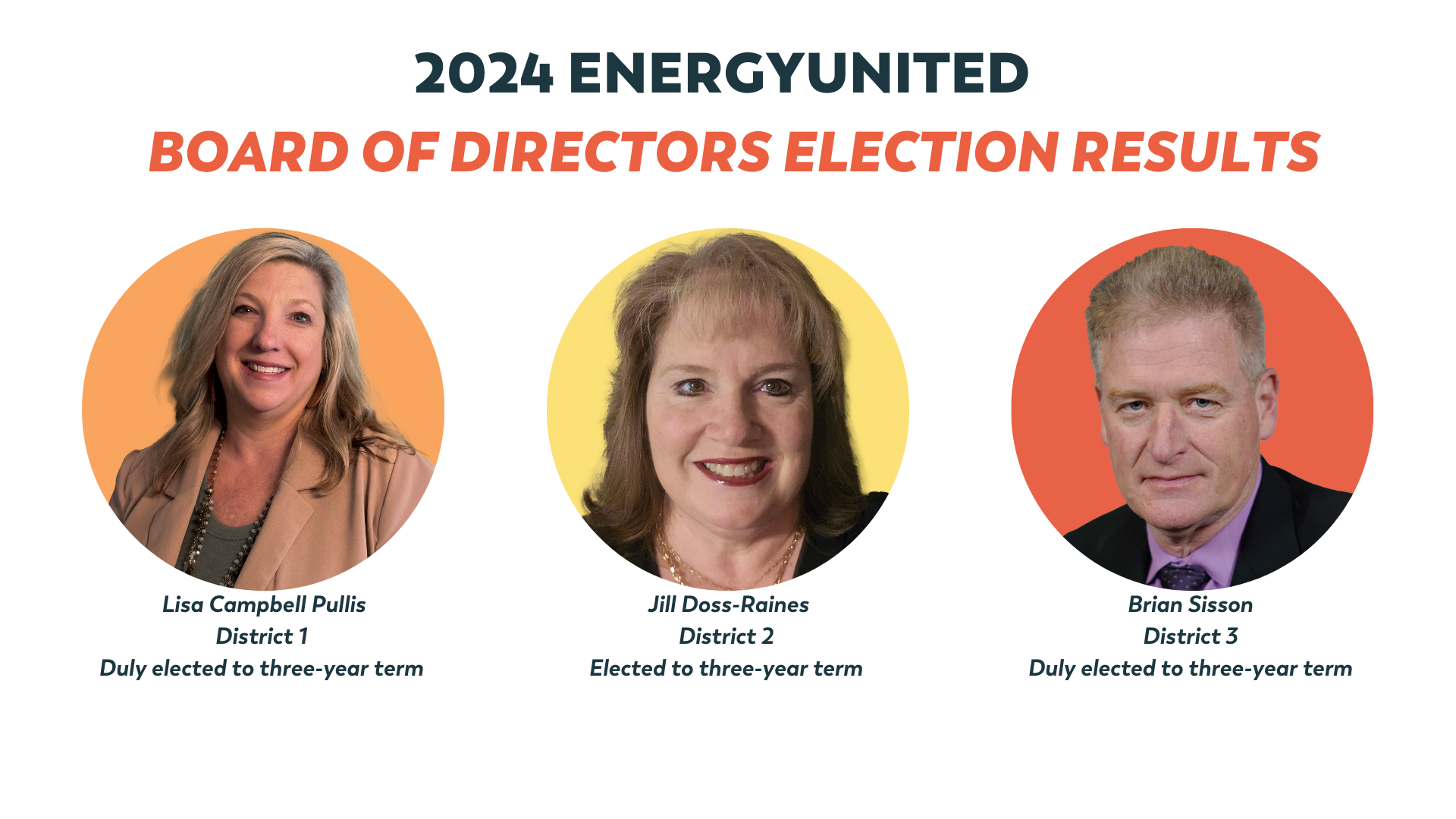 STATESVILLE, N.C. – EnergyUnited is pleased to announce the results of its 2024 Board of Directors Election. Voting in the 2024 Board of Directors Election ended on September 9, and results were certified by the cooperative’s Credentials & Election (C&E) Committee members. Three candidates were elected to serve a three-year term, beginning September 19, 2024.