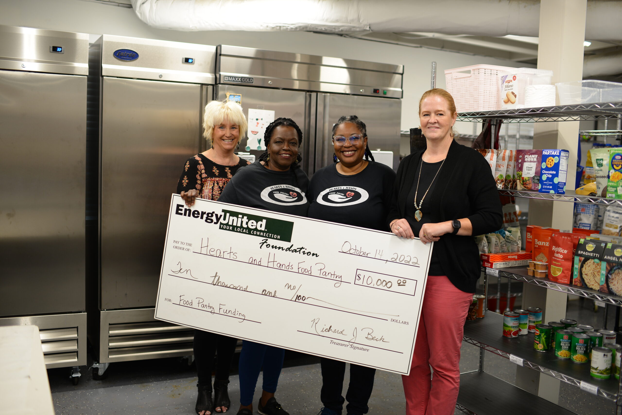STATESVILLE, N.C. – The EnergyUnited Foundation has donated $10,000 to Hearts and Hands Food Pantry of Huntersville to provide support for the purchase of additional refrigeration and freezing equipment and for the bulk purchase of food.