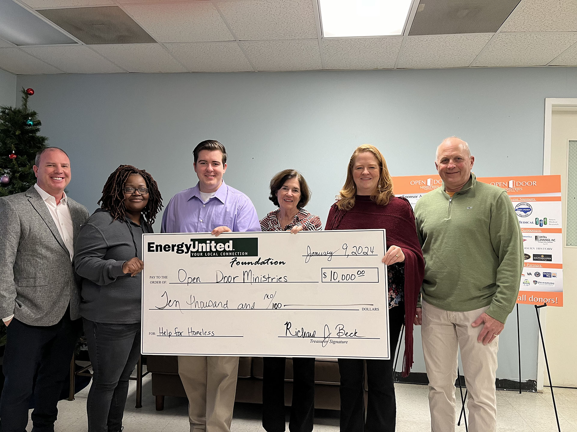 From Left to Right: Ryan Ross, executive director, Open Door Ministries; Zandra Adderly, Member Support Specialist, EnergyUnited; Ivan Huffman, director of advancement, Open Door Ministries; Lore Fariss, co-chair, Open Door Ministries Board of Directors; Debra Citta, program coordinator, EnergyUnited; and Don Shaw, treasurer, Open Door Ministries Board of Directors.