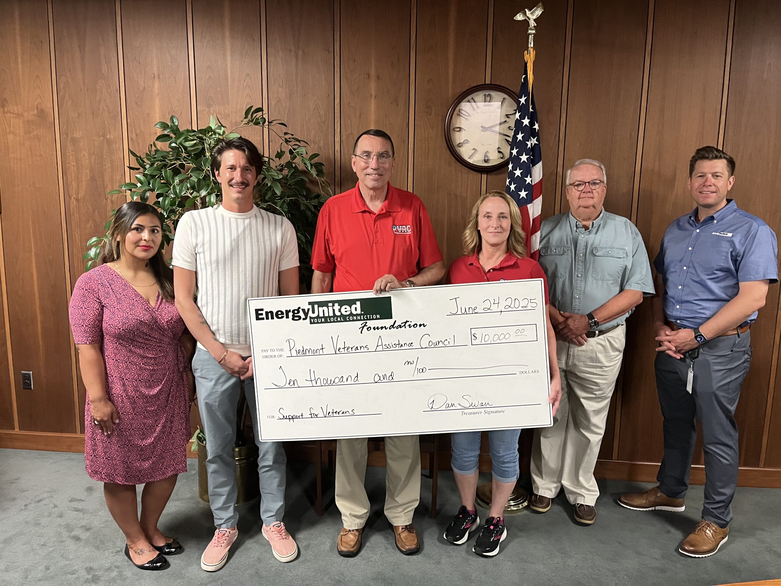 From Left to Right: Cristin Hernandez, member support specialist, EnergyUnited; Kyle Milwood, member support specialist, EnergyUnited; James Mallory, III, president, Piedmont Veterans Assistance Council Board; Julie Zacholl, executive director, Piedmont Veterans Assistance Council; Nat Hyde, board member, EnergyUnited Foundation; Thomas Golden, chief executive officer, EnergyUnited.