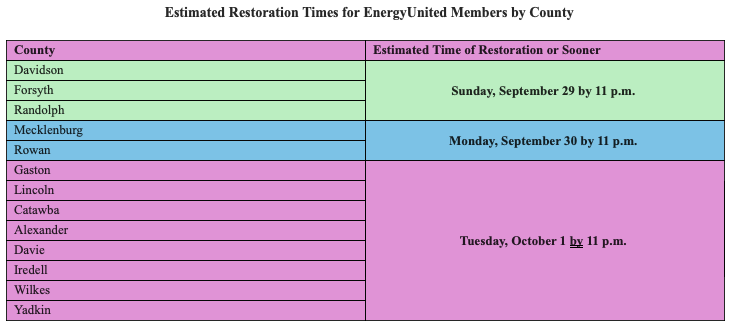 “We are making steady progress restoring power and will continue to work relentlessly to restore power to all members who were affected by Helene,” said Steve McCachern, vice president of energy delivery for EnergyUnited. “We appreciate the ongoing efforts of our crews, and also the support we received today from mutual aid crews who arrived from Ohio, Pennsylvania and New Hampshire.”