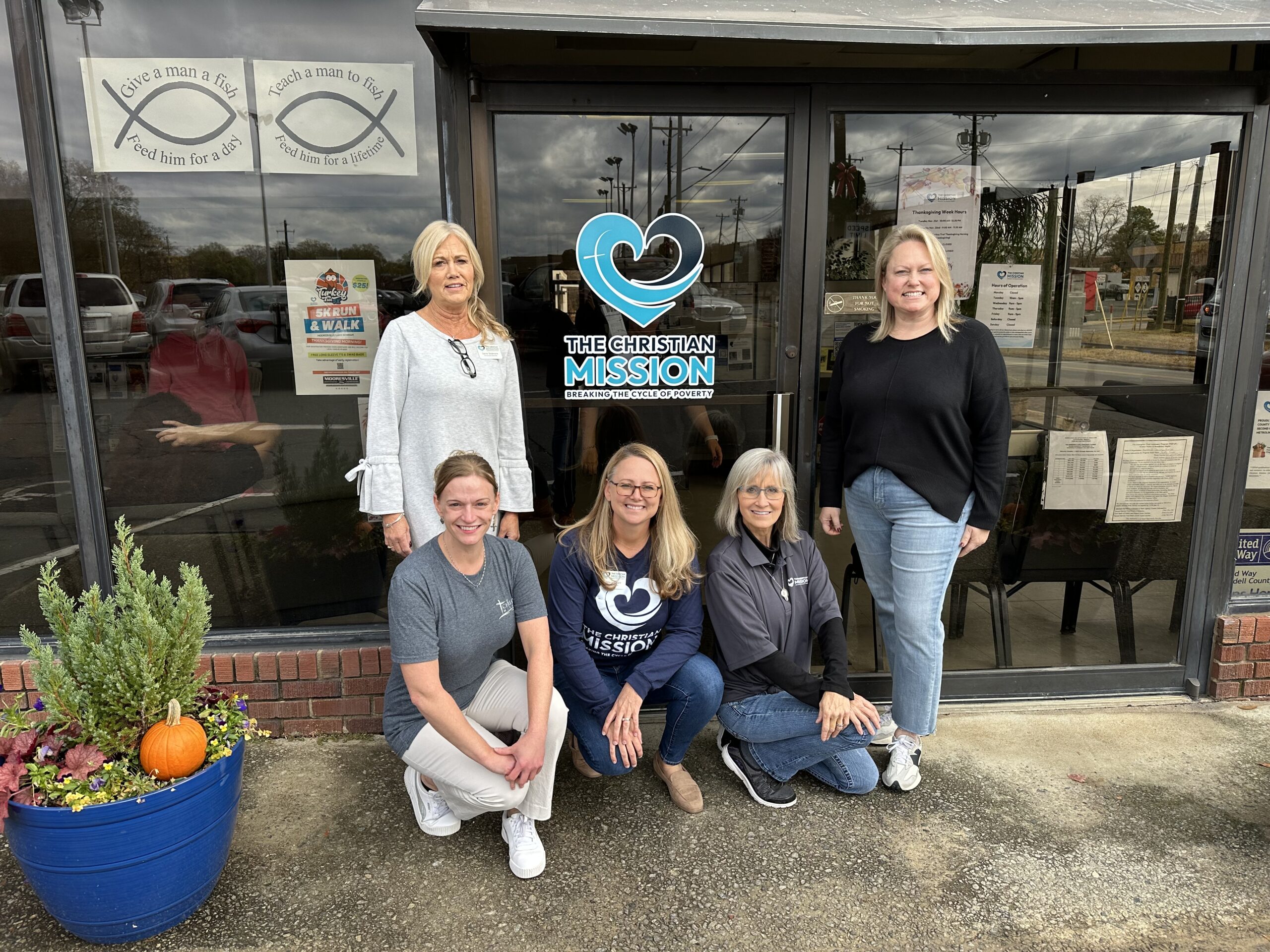 Pictured from Left to Right: Dana Skidmore (Back), Warehouse Associate, Mooresville Area Christian Mission (Christian Mission); Beth Briley (Front), Intake Specialist, Christian Mission; Amy LaCount, Executive Director, Christian Mission; Victoria Clifton, Warehouse Supervisor, Christian Mission; and Sheri Campbell, Financial Administrator, Christian Mission.
