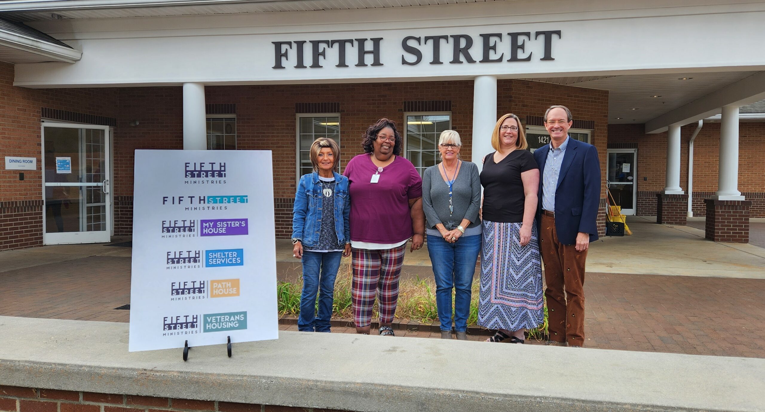 Pictured from Left to Right: Cindi Bacon, Shelter Case Manager, Fifth Street Ministries; Latonya Freeman, Outreach Case Manager, Fifth Street Ministries; Deborah Owen, Shelter Case Manager, Fifth Street Ministries; Michelle Knapp, Executive Director; and David Nolen, Veterans Case Manager, Fifth Street Ministries.